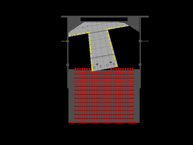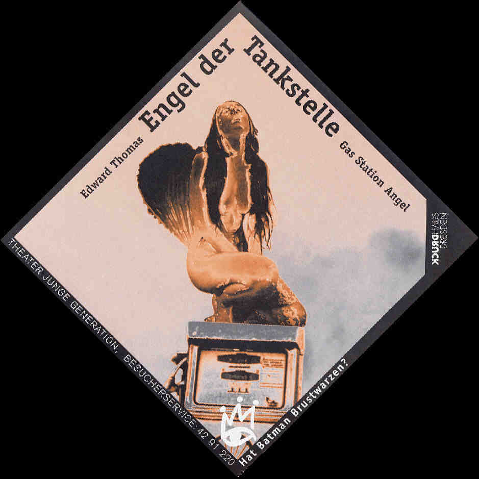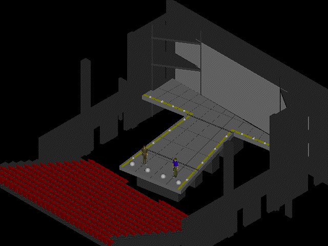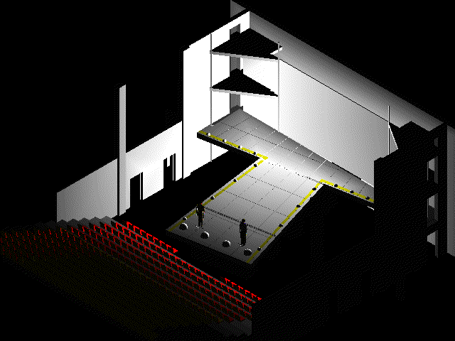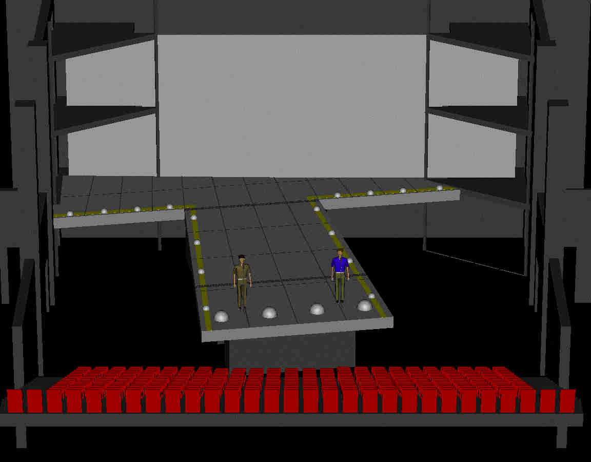überdimensionalen T, welches schräg im Theaterraum steht und von hinten nach vorne von 2,5 Meter auf 2 Meter abfällt.Die Oberfläche dieses Ts sieht aus wie die Landepiste eines Flugplatzes, das Bild wird abgeschlossen durch eine